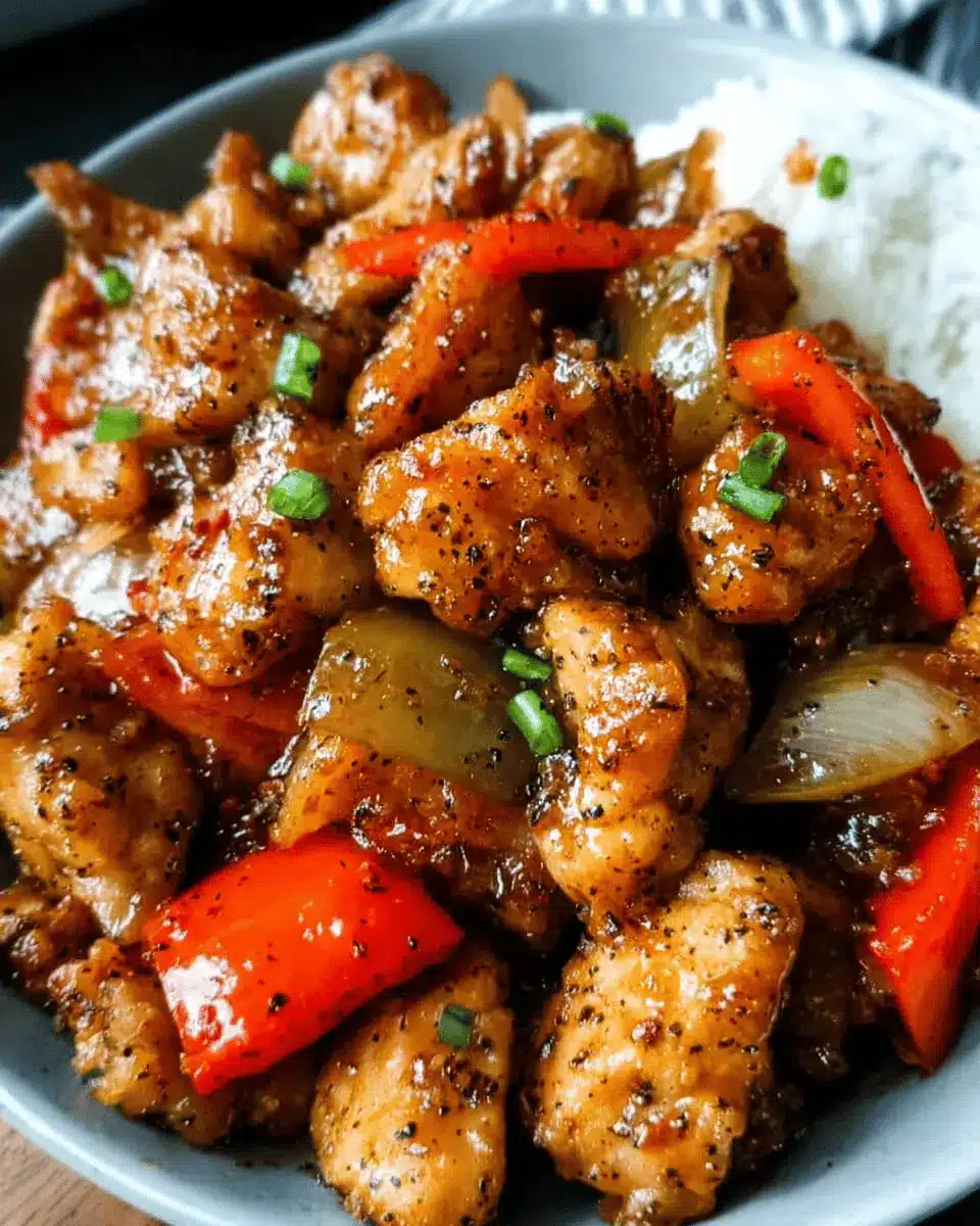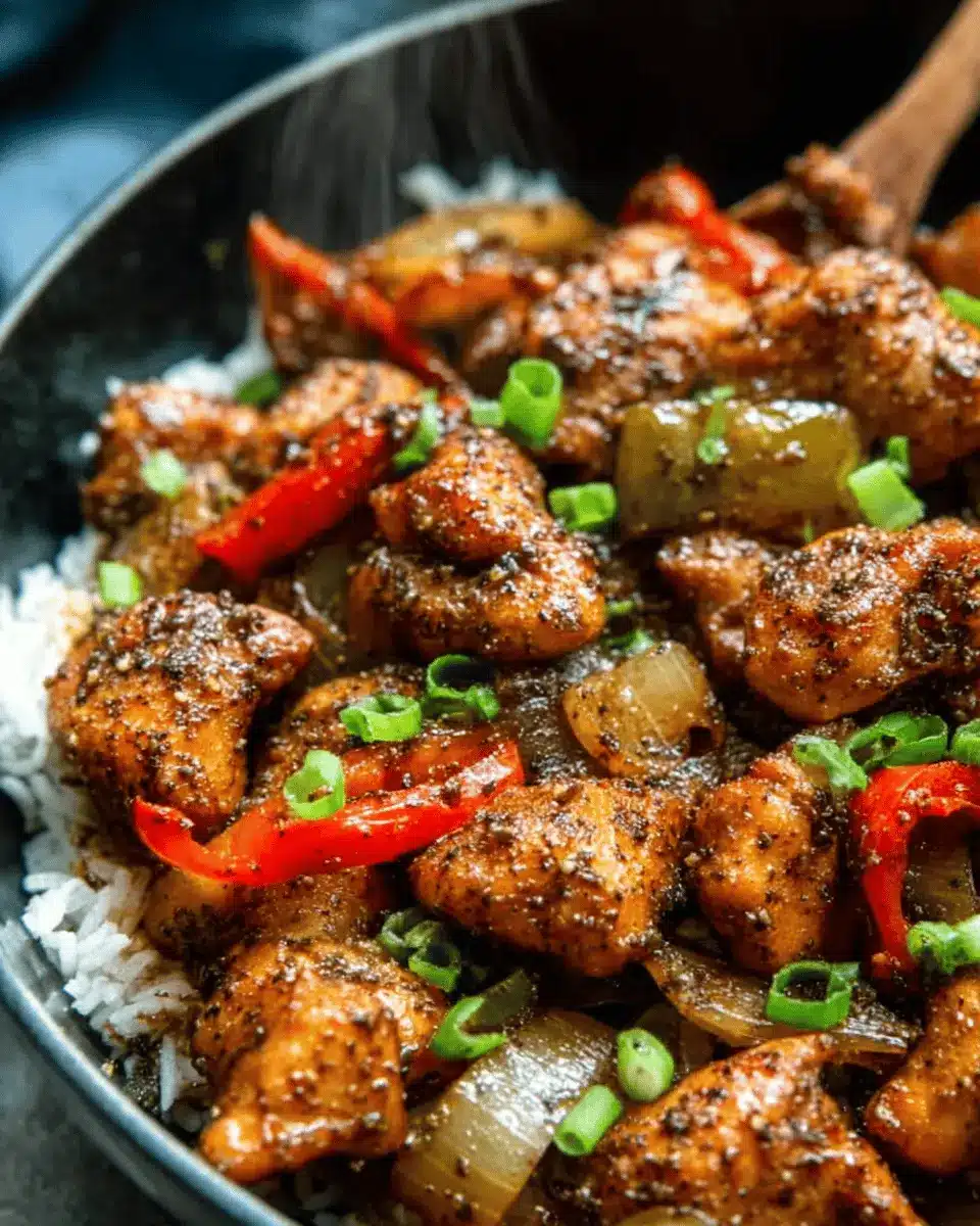 For an Instagram-worthy presentation, serve your black pepper chicken over a mound of fluffy white rice. Garnish with finely chopped green onions or sesame seeds for added color and texture. Consider using a large white plate to make the vibrant colors of the chicken and veggies pop. You might also want to add a sprig of fresh cilantro or parsley on the side for that extra touch. Happy dining!