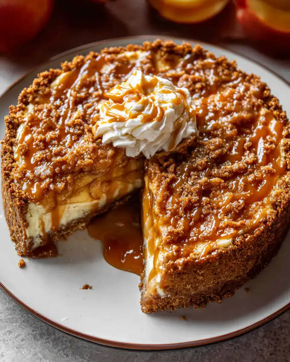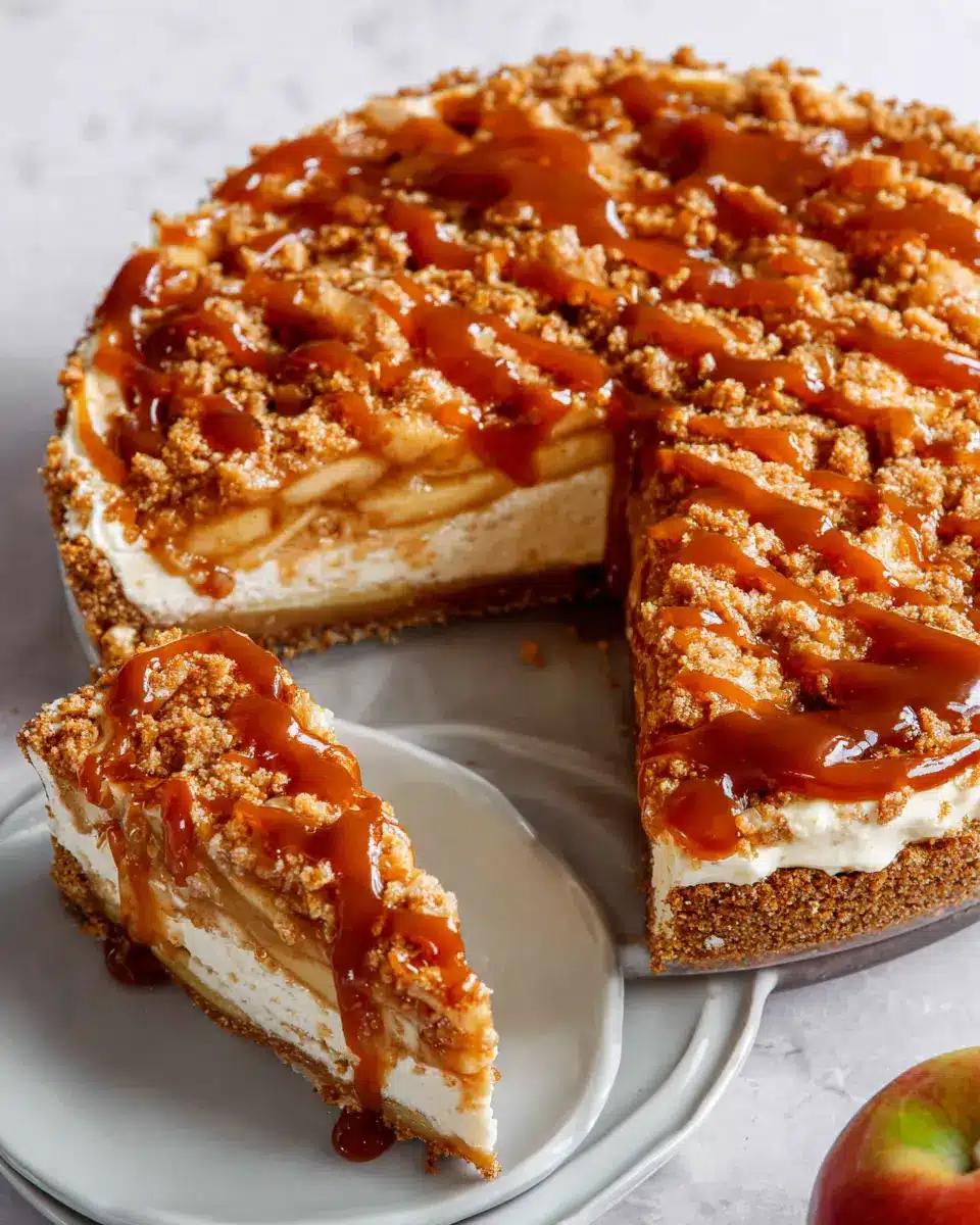 - Assemble the layers: Spread cheesecake filling into the crust. Spoon apples in an even layer on top. Drizzle salted caramel over the apples. Sprinkle streusel evenly on top.