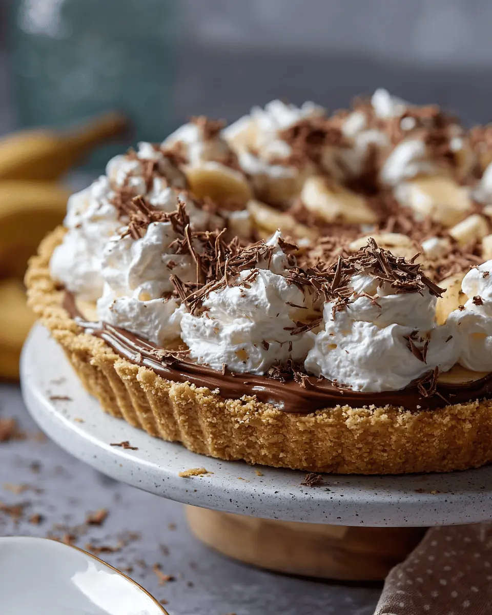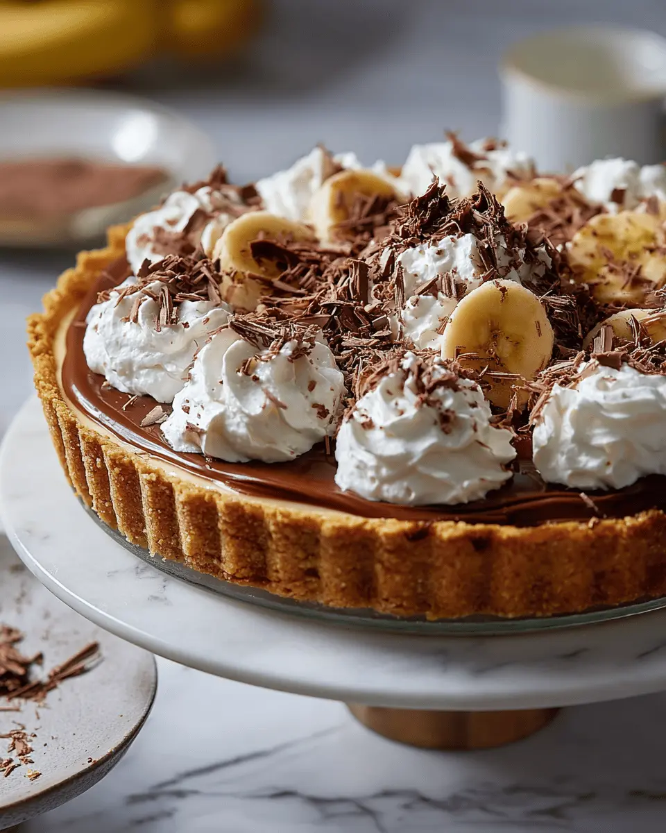 Now, it’s assembly time. Gently swirl the whipped cream over the bananas, spreading it out evenly. For a finishing touch, sprinkle chocolate shavings over the top to make your Classic Banoffee Pie look even more enticing. Cover it loosely with plastic wrap and refrigerate for at least 2 hours. This chilling time allows the flavors to meld together beautifully.