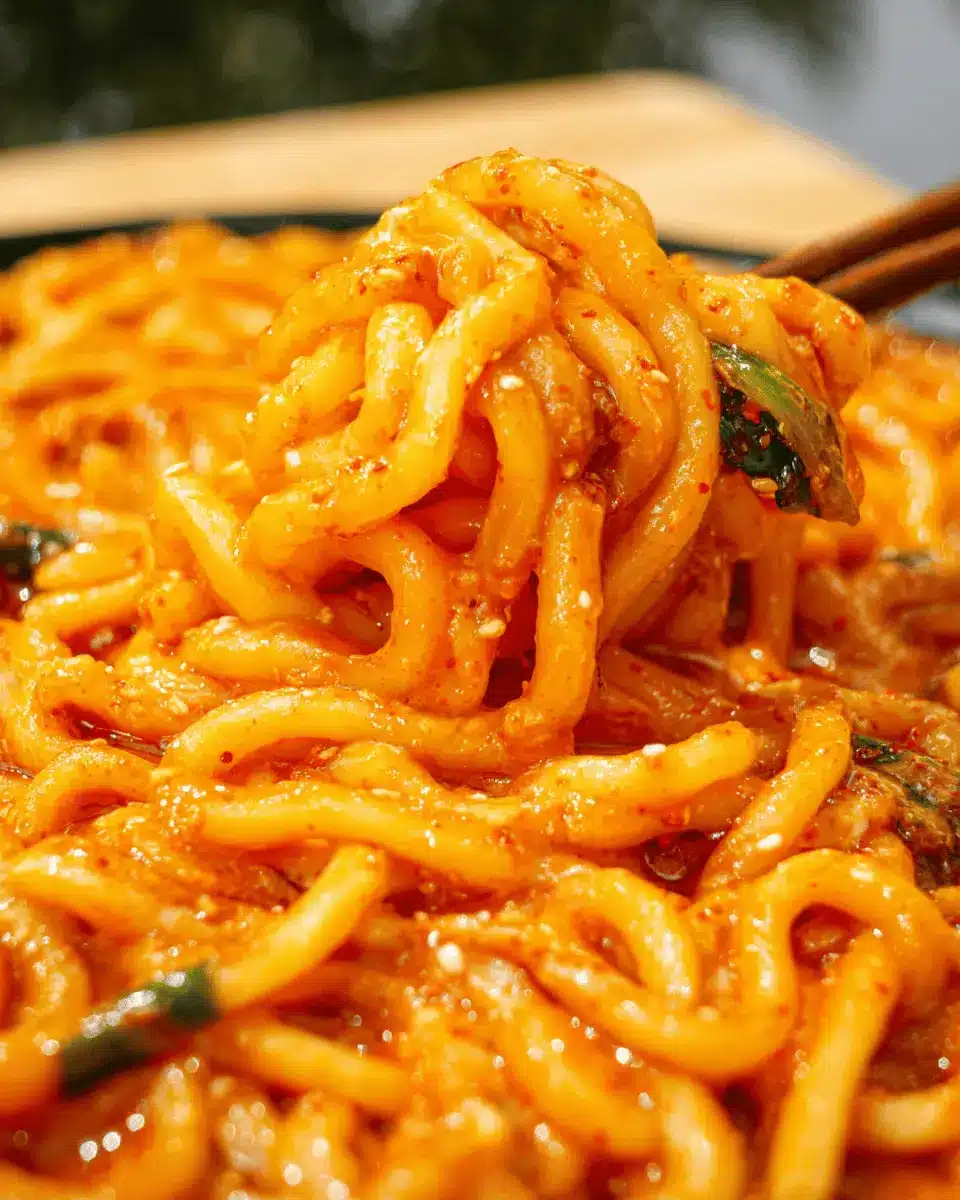 Once your sauce is just right, it’s time to bring it all together. Add the cooked udon noodles directly into the pan and toss everything gently to coat the noodles evenly. Imagine each strand of udon soaked beautifully in that creamy gochujang sauce—it’s a comforting sight to behold. Make sure every noodle gets some love from the sauce!