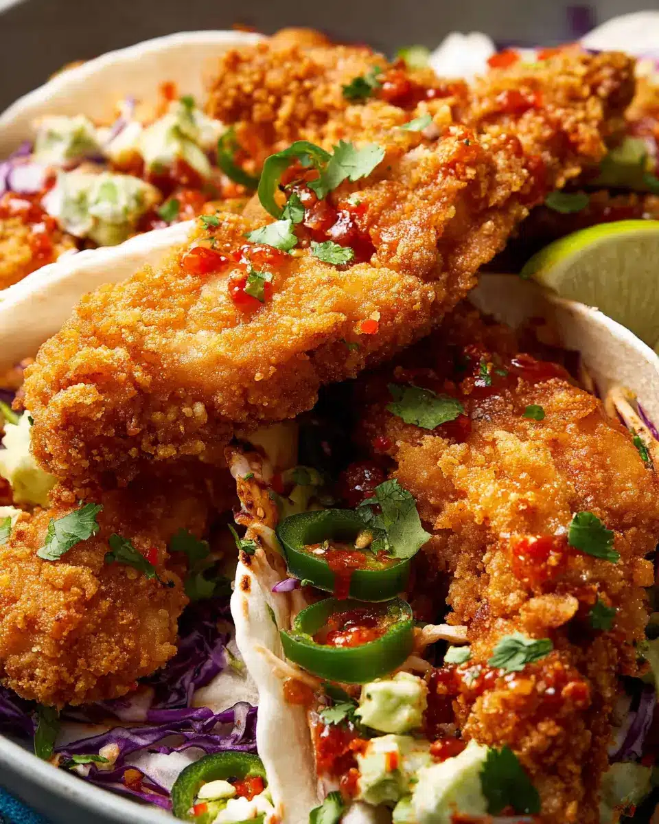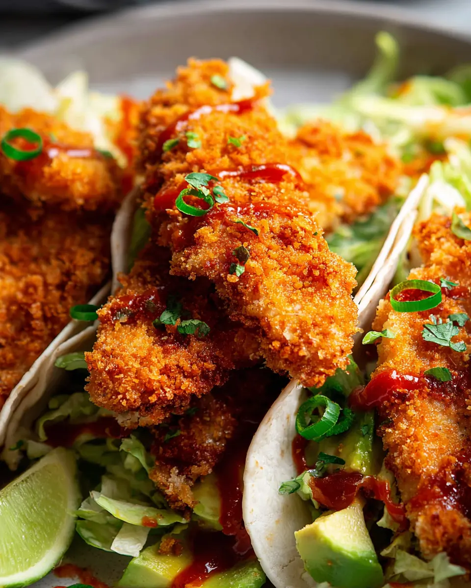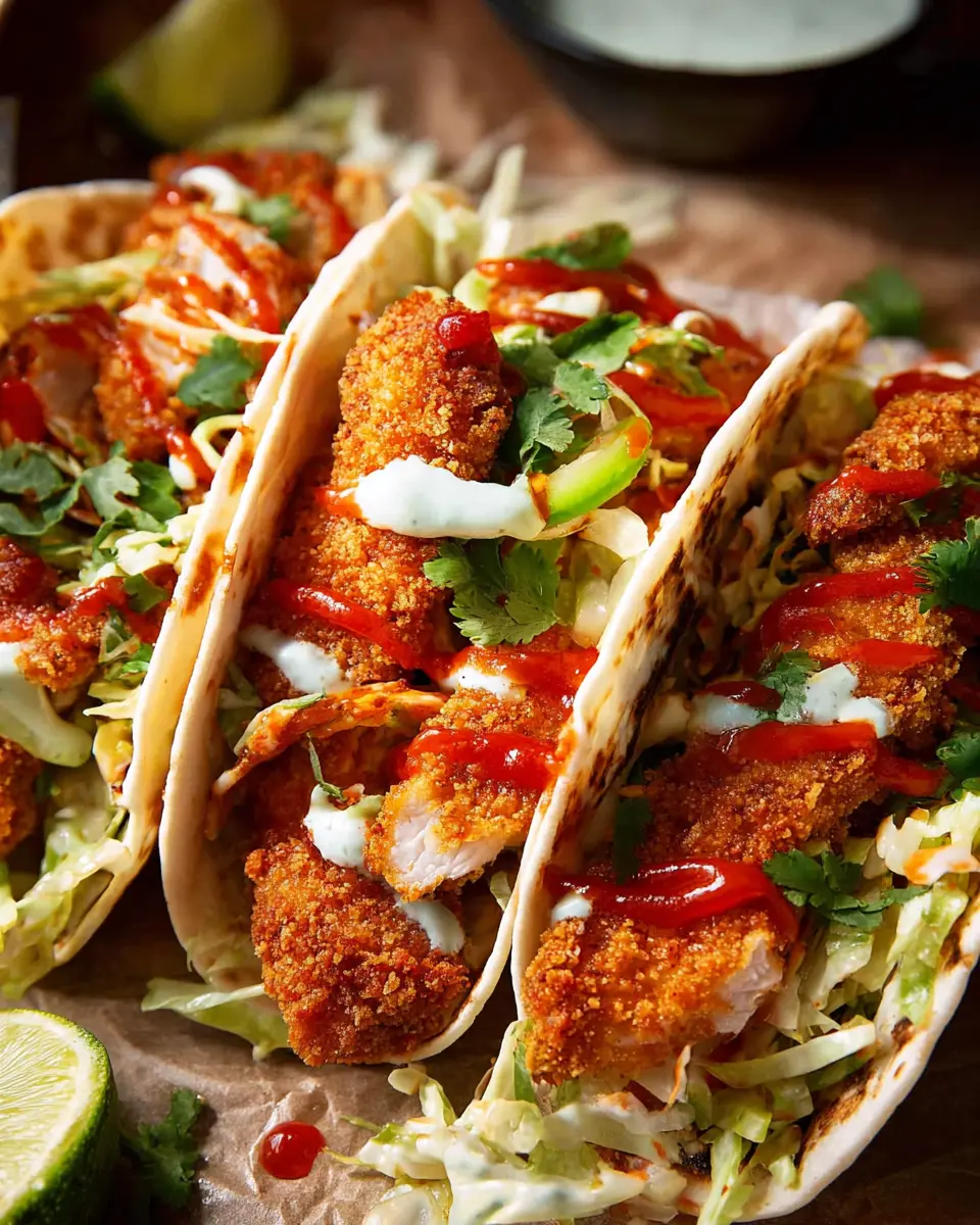 Now comes the fun part—assembling your tacos! Lay out a warm tortilla and pile on your crunchy chicken finger, followed by some taco slaw, avocado slices, and a drizzle of sriracha for that kick. Finish off with fresh cilantro leaves, and there you have it—delicious crunchy chicken taco fingers, ready to be devoured.