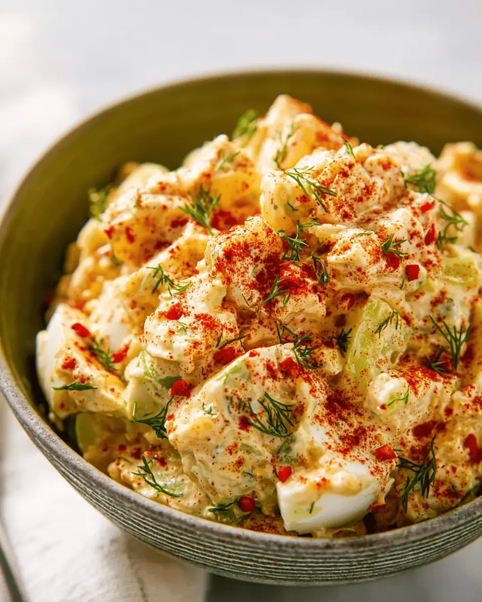 To serve, spoon the chilled salad into a decorative bowl or scoop it onto individual plates. Garnish with an extra sprinkle of paprika or a few green onion tops for a fresh look. Serve alongside whole-grain toast or crackers for added texture.