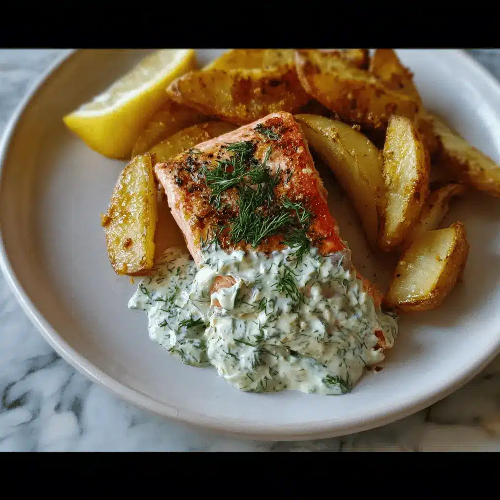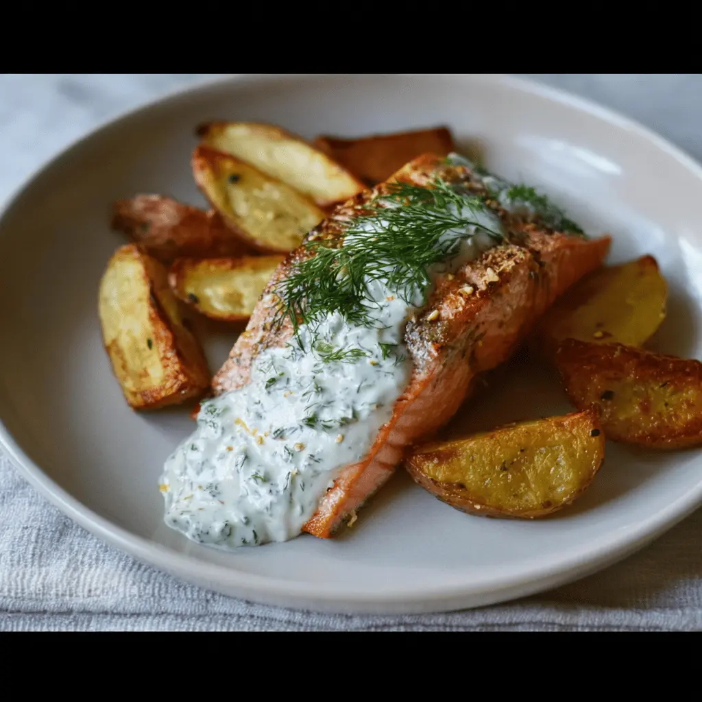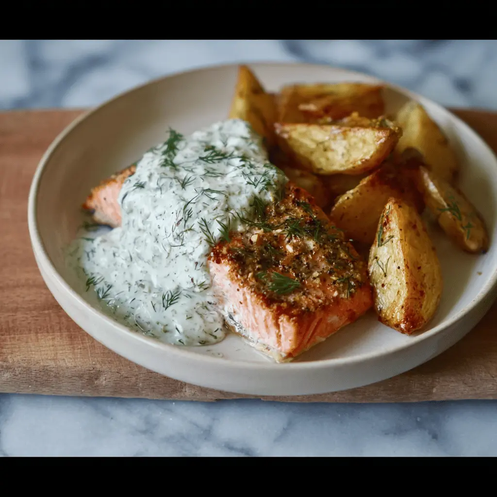 Dill salmon with potato wedges and a creamy pickle and dill sauce