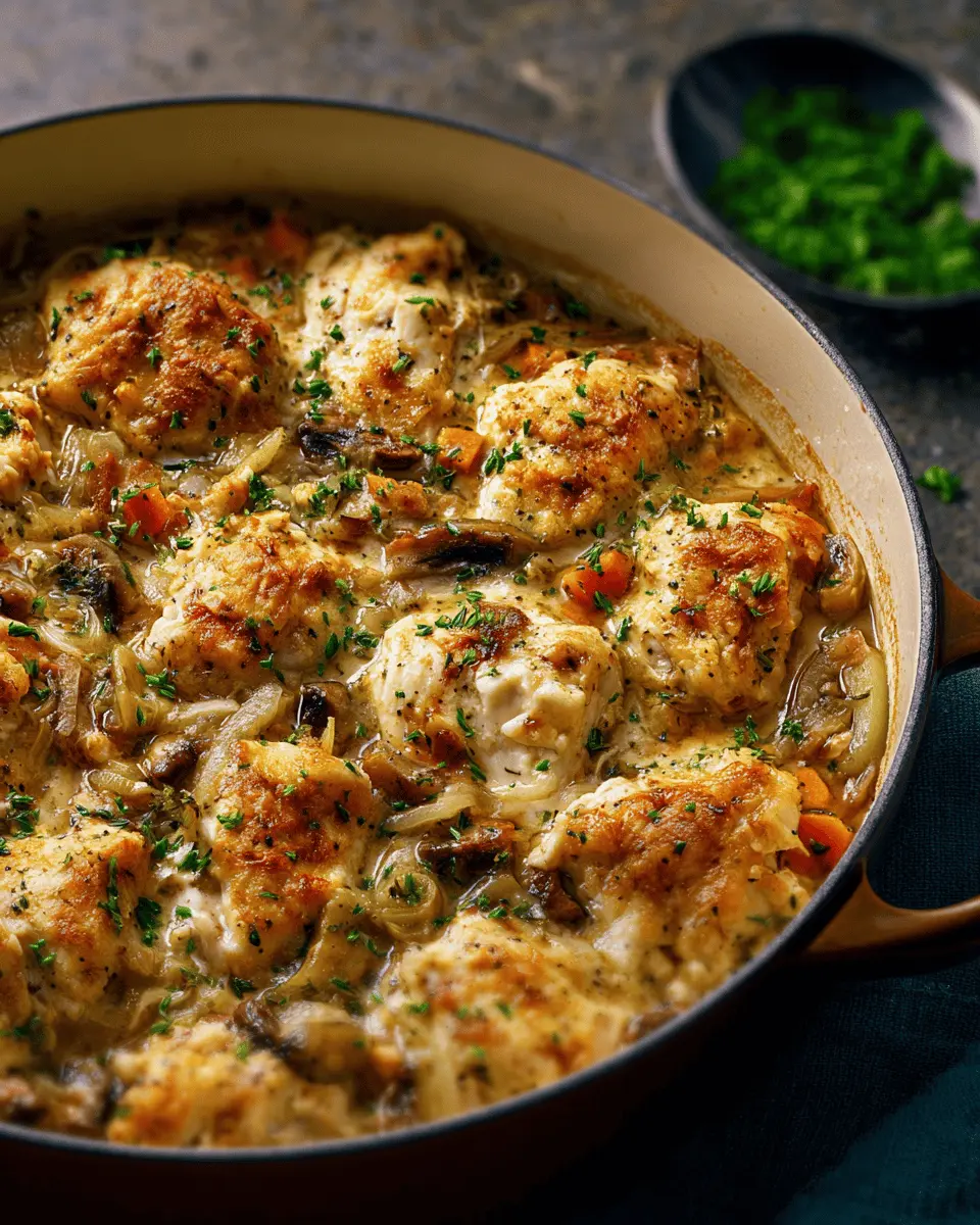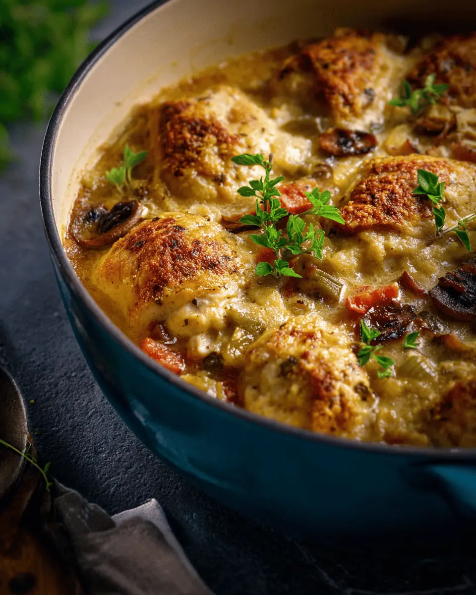 For a delightful twist on the classic easy chicken casserole, try incorporating a creamy mushroom sauce. Simply replace the stock with a mixture of chicken stock and heavy cream, adding richness to the dish. Sauté the mushrooms and layer in some garlic for an extra flavor boost. This variation adds a splendidly creamy texture that pairs beautifully with the tender chicken thighs.