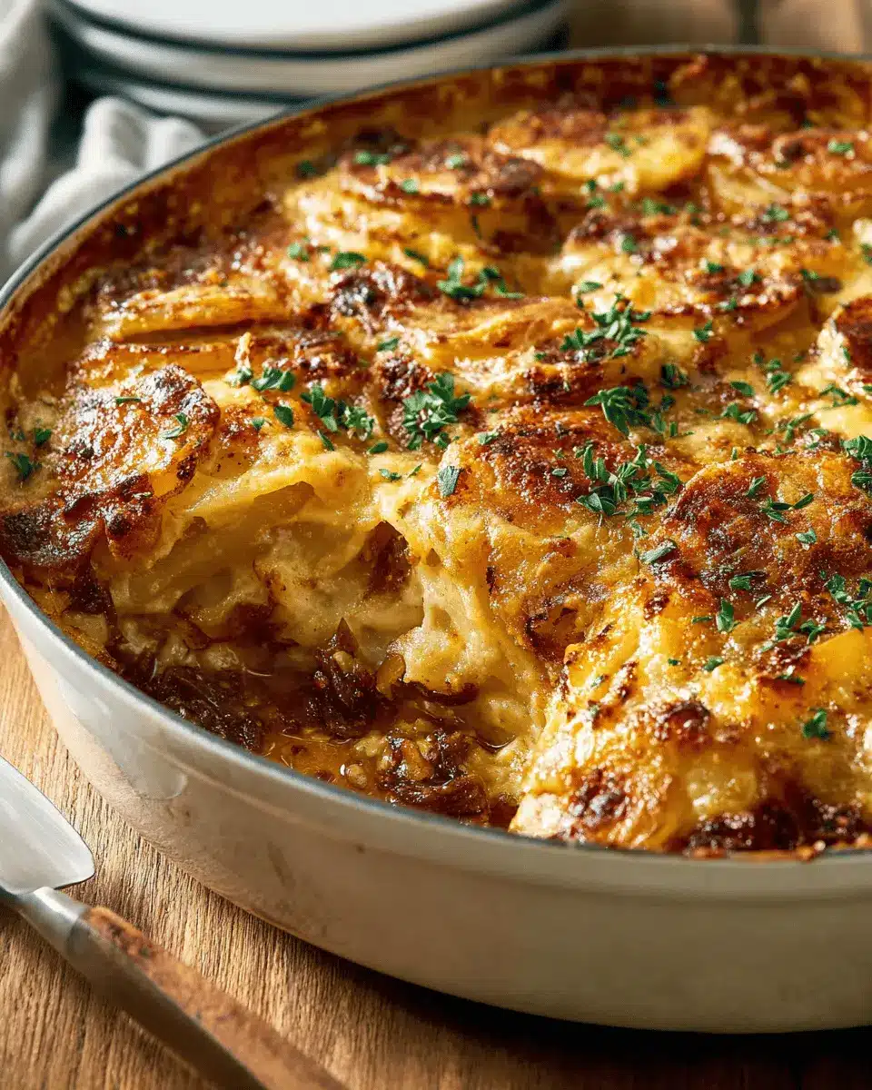 Why not elevate your French Onion Potatoes au Gratin by incorporating greens? Adding layers of sautéed spinach or kale between the potatoes can enhance the flavor while also introducing a pop of color. A handful of fresh arugula scattered on top before serving offers a delightful peppery finish, blending beautifully with the richness of the cheese. It’s a great way to sneak in some nutrients while keeping the dish hearty and satisfying.