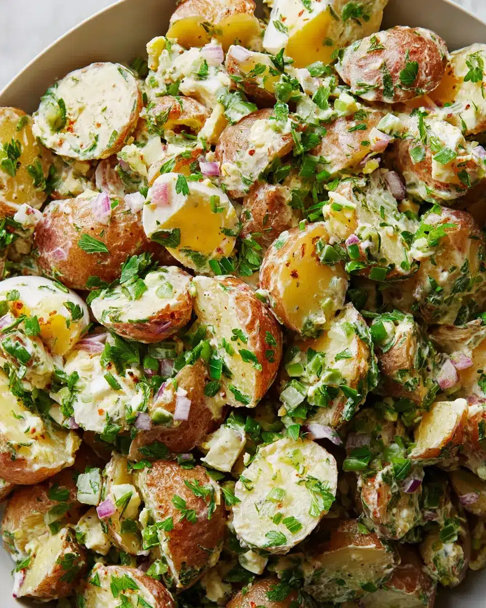 French Potato Salad, or salade de pommes de terre, is a delightful twist on the classic side dish that you might be familiar with. Unlike its heavier counterparts, this salad features tender, baby potatoes tossed in a tangy dressing that brings out the natural flavors of the ingredients. The star components include extra virgin olive oil, grainy Dijon mustard, and fresh herbs, which lend a vibrant taste profile that pairs beautifully with just about any meal.