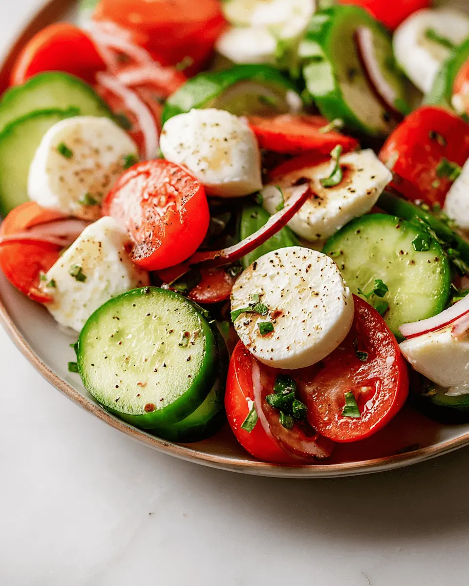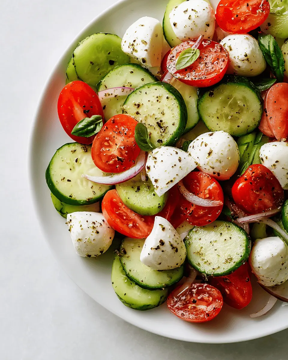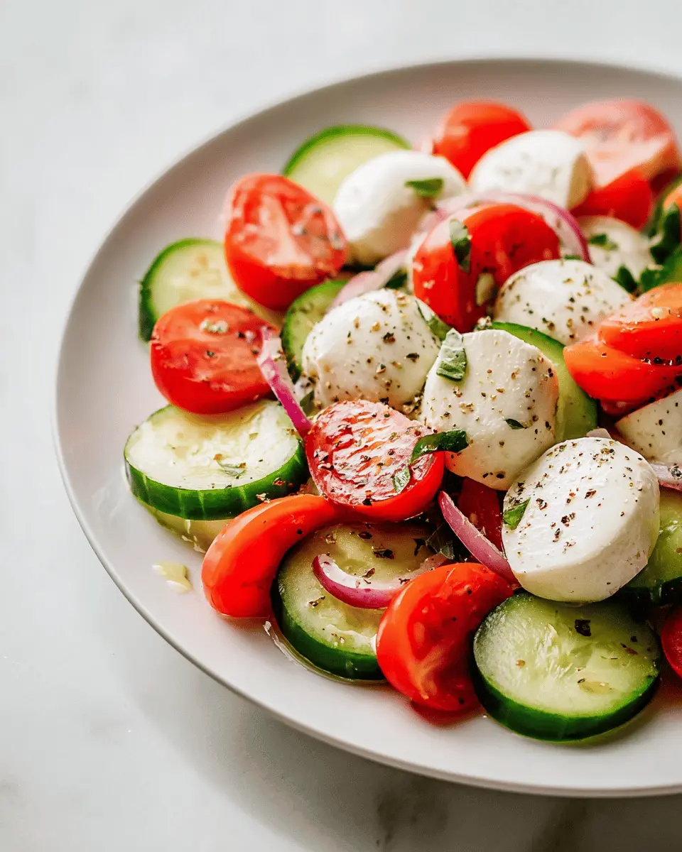 Absolutely! You can prepare the fresh cucumber caprese salad a few hours in advance. Just whip up the marinade and toss the veggies and cheese together, then store it in the fridge. This allows the flavors to meld beautifully. However, it’s best to add the mozzarella just before serving for the best texture.
