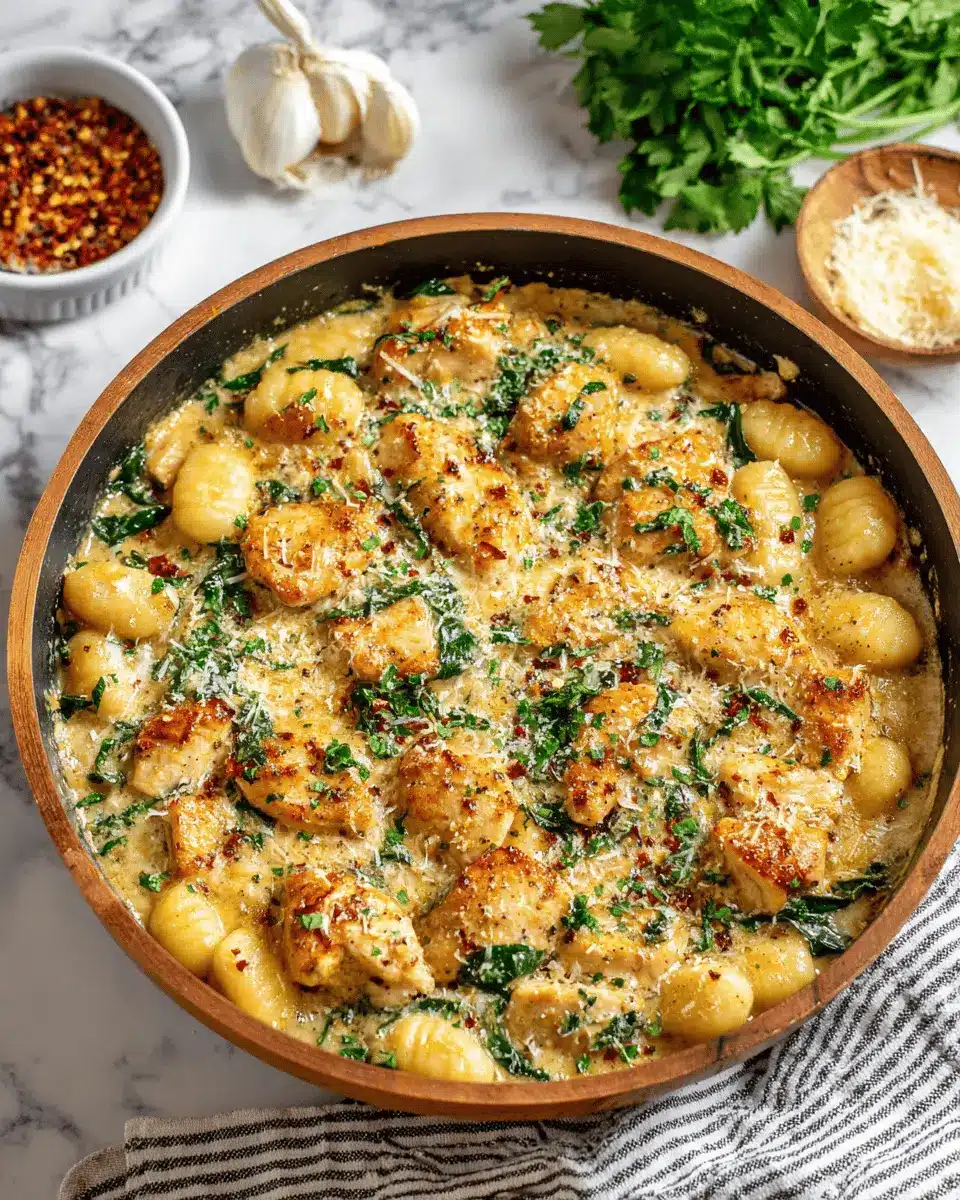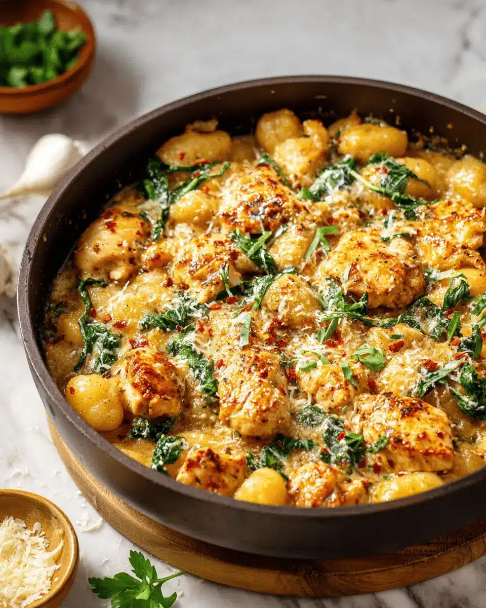 In summary, the Garlic Chicken Gnocchi Skillet is a quick and delightful dish that combines tender chicken thighs, pillowy gnocchi, and vibrant spinach. Perfect for busy weeknights, it offers a comforting meal that doesn’t skimp on flavor. Try it tonight for an unforgettable dinner experience!