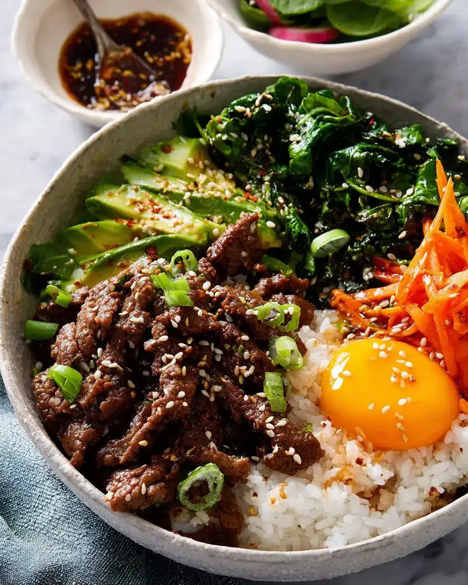 Creating a visually stunning dish is part of the joy of cooking! Start by layering your Korean Beef Bulgogi Rice Bowls with a generous scoop of fluffy rice, then mound the savory bulgogi beef on top. Arrange the wilted spinach and julienned carrots artfully around the bowl, and don't shy away from garnishing with bright pickled ginger and creamy avocado. Finish with a sprinkle of sesame seeds and sliced green onions for a pop of color. A drizzle of your drizzle sauce will elevate the whole look!