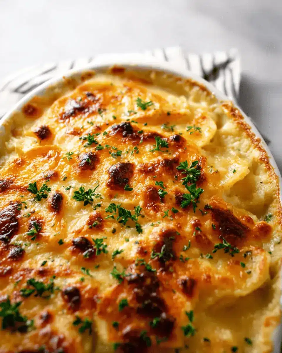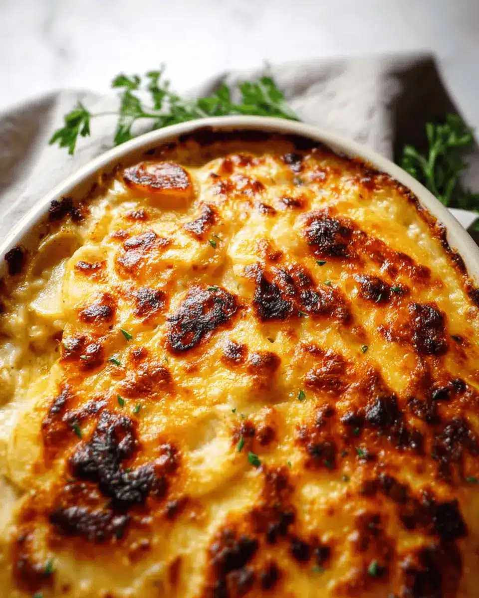 Position your oven rack in the middle and preheat to 350°F. Place your assembled dish in the oven and also use a cookie sheet on the bottom rack to catch any drippings. Bake uncovered for 1 hour and 30 minutes, keeping an eye on it: you want those potatoes tender and the top golden. If it’s not quite there yet, cover it with aluminum foil and continue roasting until done. Let it rest for about 15 minutes, then serve and dive into pure cheesy bliss!