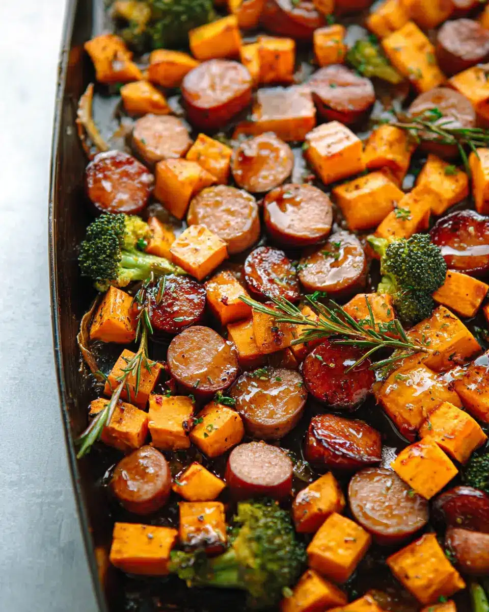 Sheet Pan Sausage and Sweet Potatoes with Honey Garlic Sauce