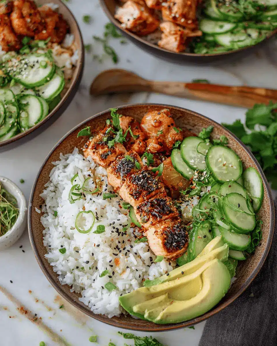 In summary, spicy salmon bowls are not only delicious but also a fantastic way to incorporate healthy ingredients into your meals. With rich flavors from the salmon, the creaminess of coconut rice, and a refreshing crunch from cucumbers, these bowls are perfect for satisfying any craving. Enjoy!