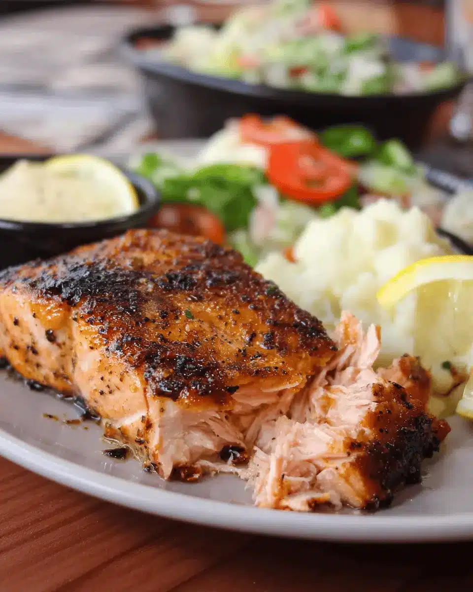 For the ideal doneness, check your salmon with an instant-read thermometer; it should be around 125ºF for a perfectly moist texture. Remove them from the skillet, garnish with a lemon wedge, and enjoy your restaurant-style Texas Roadhouse Salmon at home!