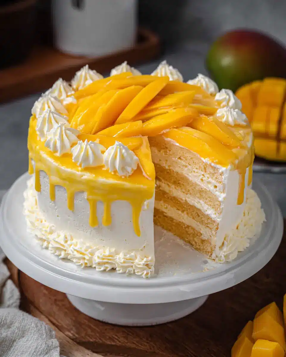 Now comes the fun part: assembly! Cut your cooled sponge cake into three equal layers. Each layer will get a thin spread of whipped cream followed by slices of fresh mango. The juicy mango next to the fluffy cream and tender sponge is a match made in dessert heaven. Be sure to take your time with each layer—this cake is all about creating contrast and balancing flavors. Finish by smoothing a final layer of cream over the cake and decorating with mango chunks.