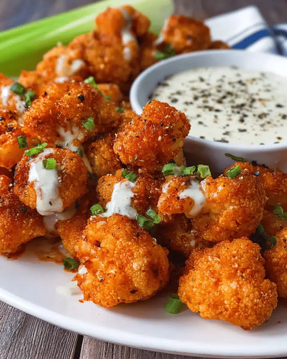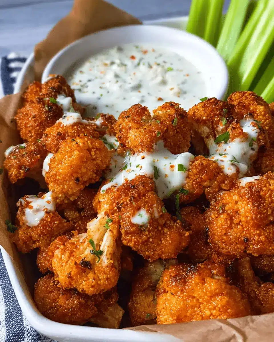 When everything is ready, serve your Vegan Cauliflower Buffalo Wings hot and crispy, paired with the ranch dipping sauce. These are perfect for game day, parties, or just a cozy night in. Get ready to dunk and enjoy your homemade creation!