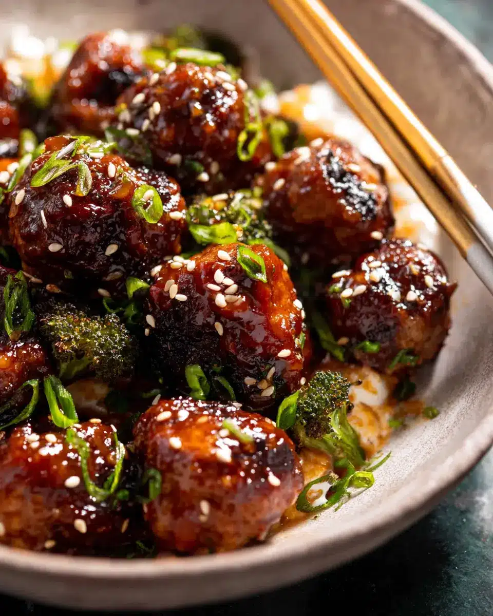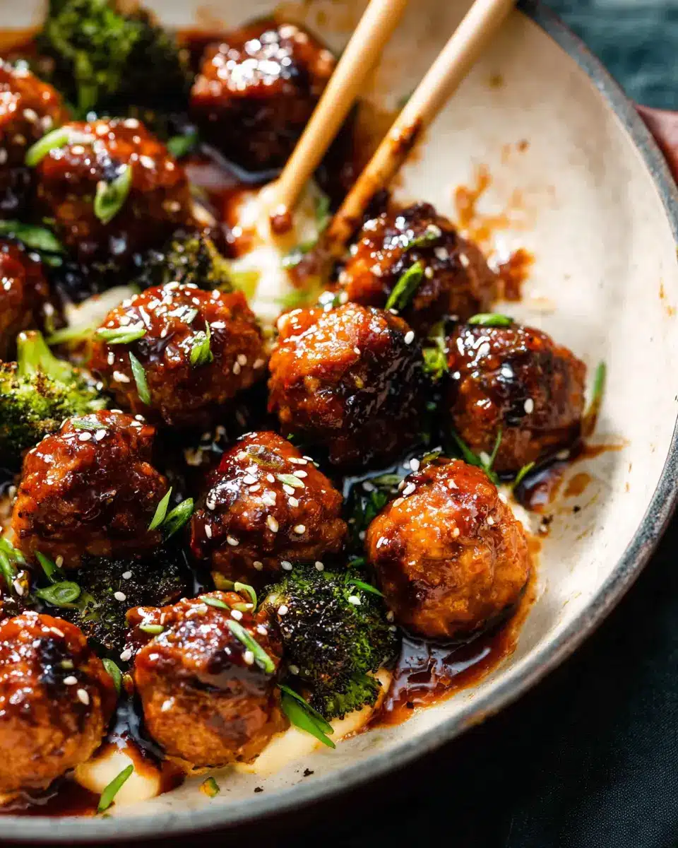 In the same skillet, add your broccoli florets and cook until they start to lightly char—this usually takes about 5 minutes. Toss in the chopped garlic, and additional ginger, and sprinkle in some chili flakes for a kick! After a minute or two, pour the prepared sauce over the entirely cooked veggies. Bring it to a boil, letting it simmer for 3-4 minutes to thicken. Then, stir in the meatballs along with your cornstarch slurry, cooking for another 2-3 minutes until everything is coated in that sticky goodness.