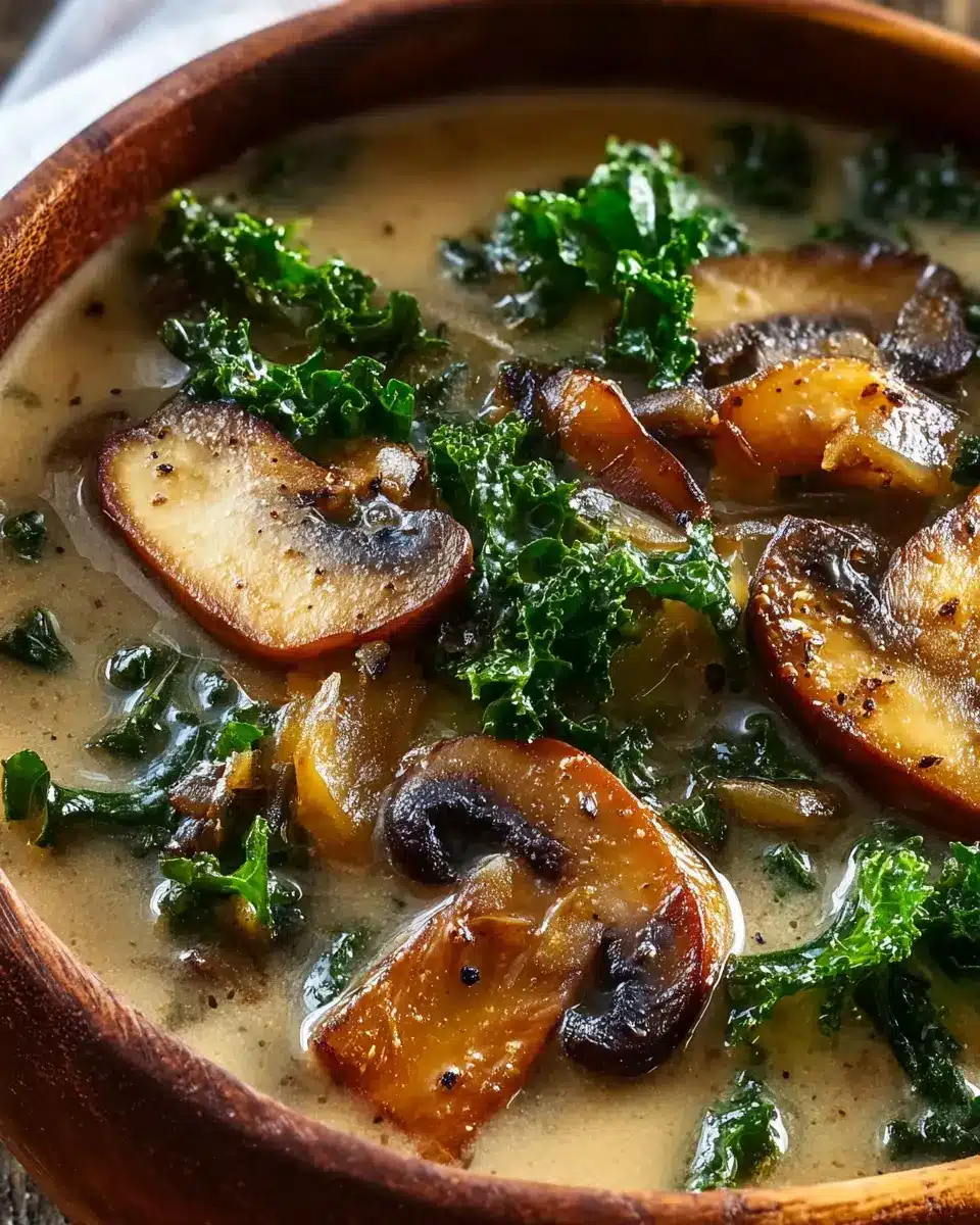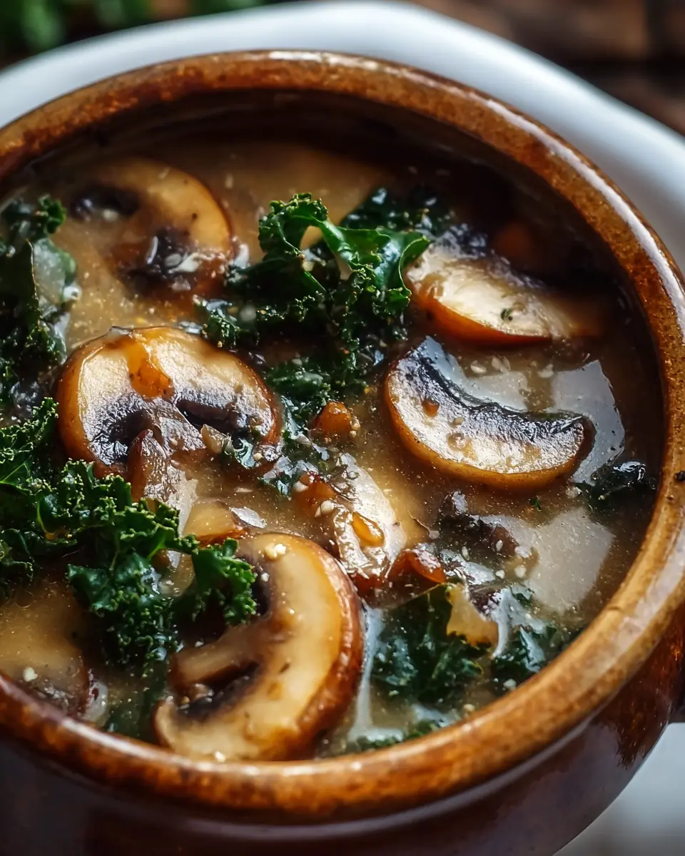 Wild Mushroom, Caramelized Onion and Kale Soup